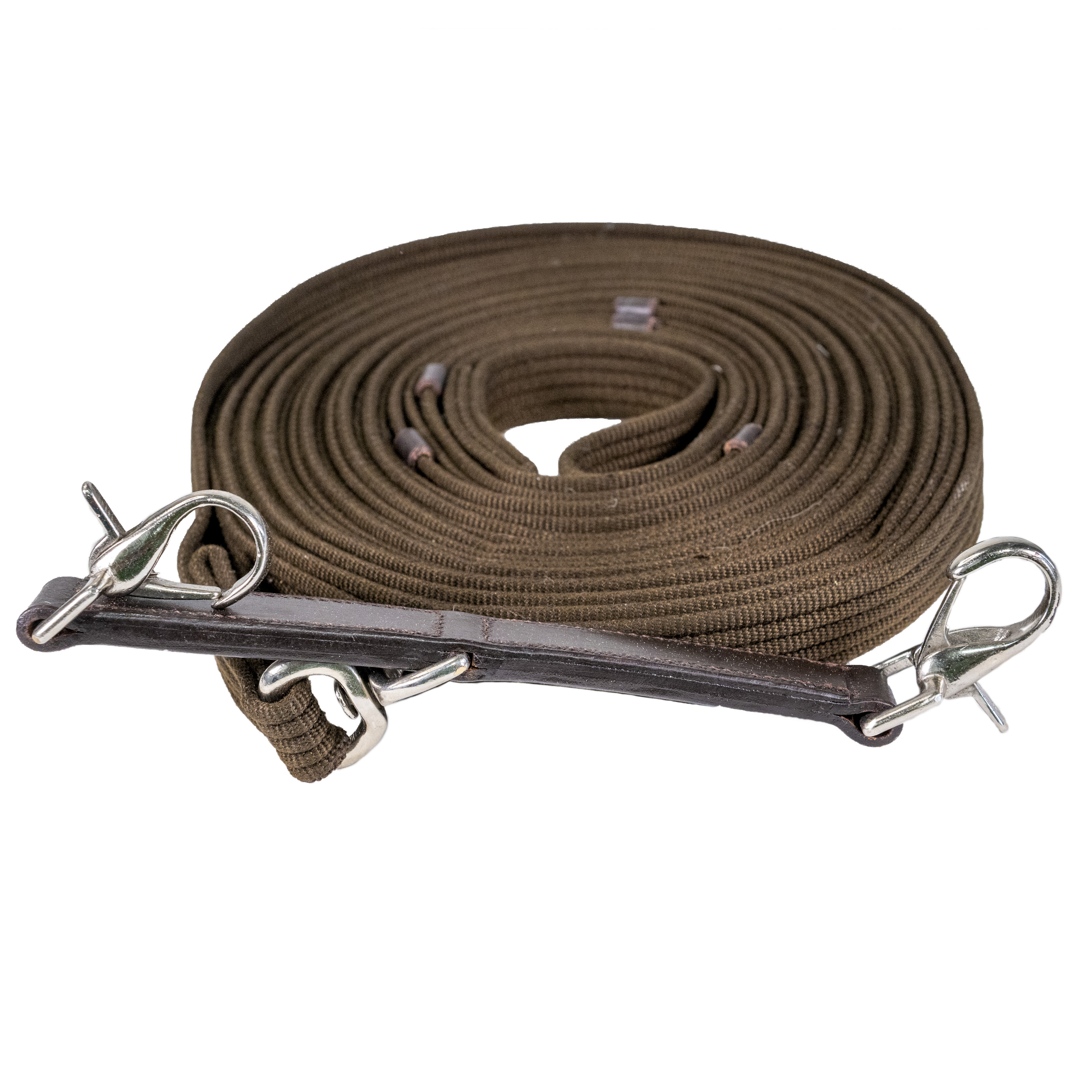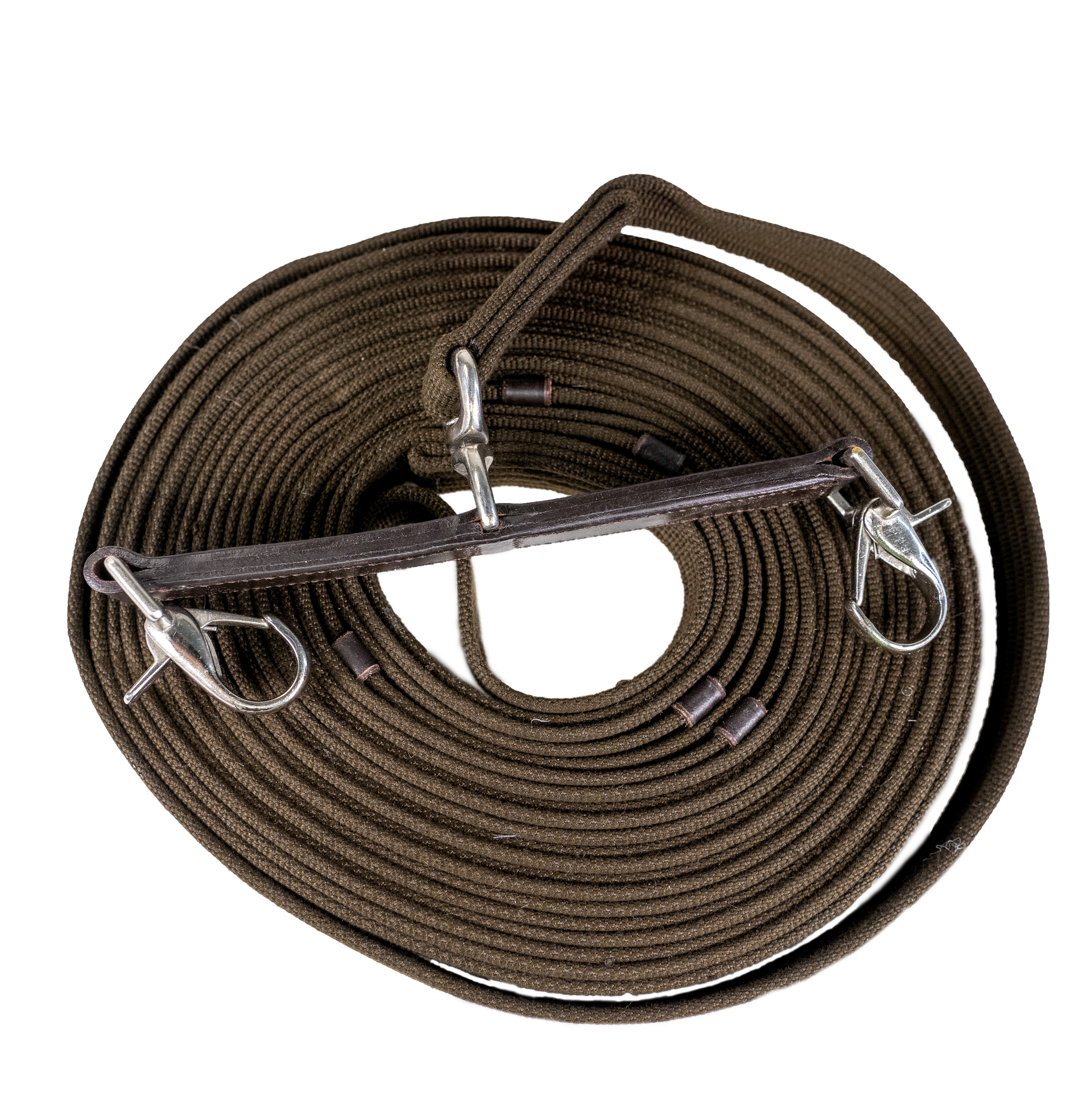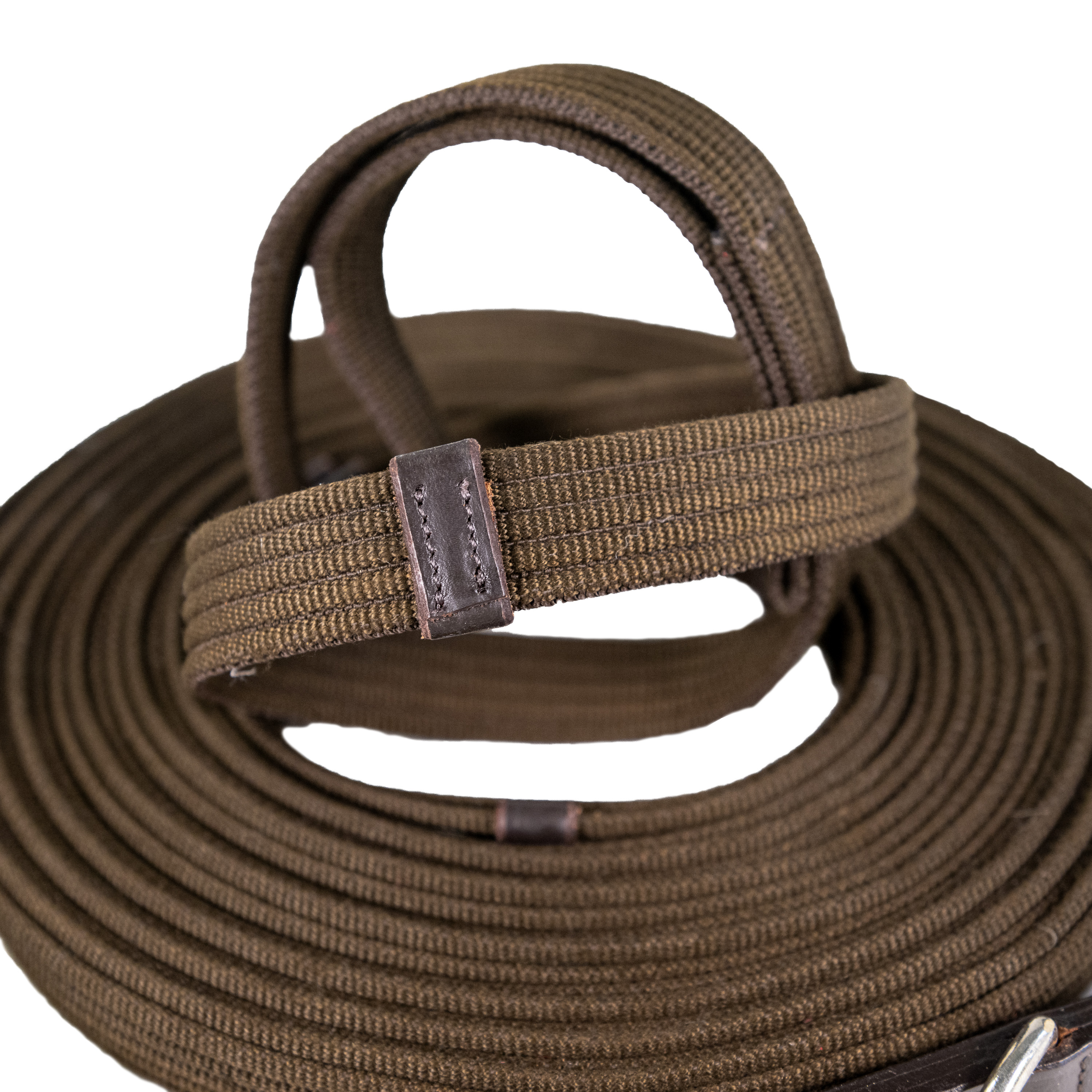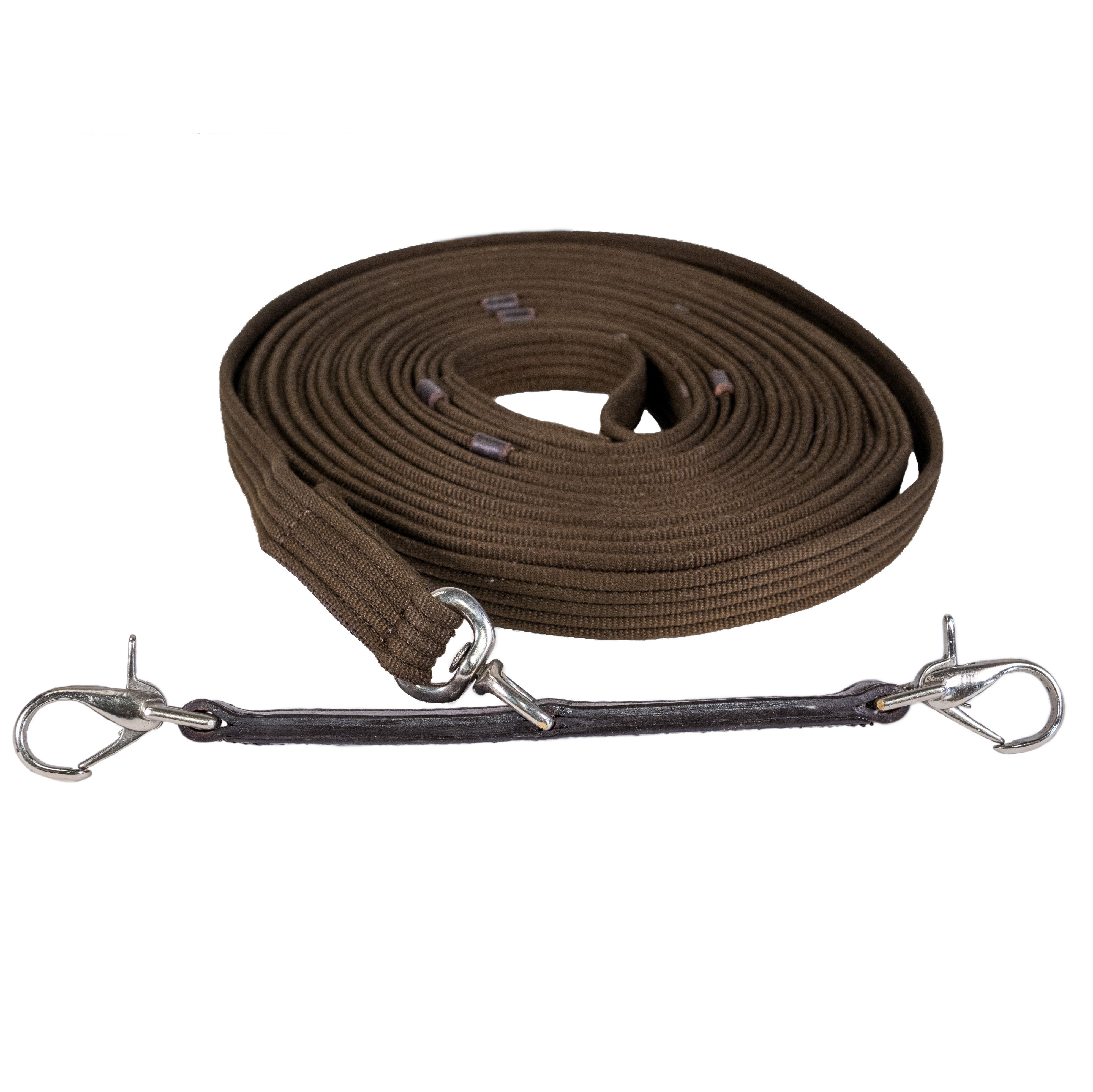 Our Beyond Complete Equestrian Lunge Line is made from the finest 100% Cotton Webbing Lunge Line on the market today. The line is 35 foot long with a sewn in lunging attachment so the attachment is always available when you need it. It ensures lunging without annoying re-buckling when changing hands as well as the safety of having two snaps attaching lunge line when using. Heavy-duty and durable. The snaps and the swivel are nickel-plated.