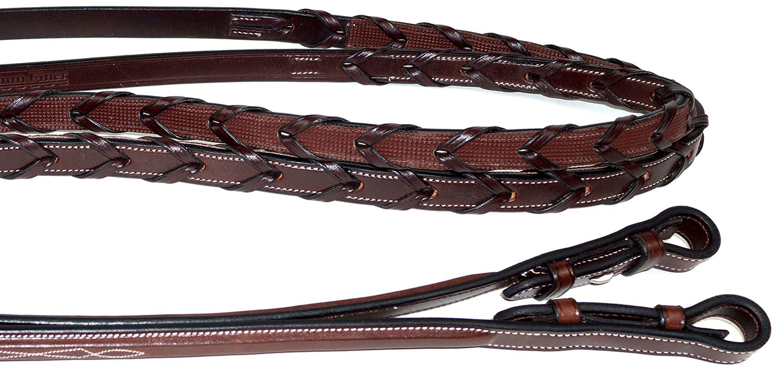 Nunn Finer Rubber Lined Fancy Stitched Laced Reins in Pony Size are the perfect way to maintain that classy laced rein look in the show ring, but with added grip that is sleek and not distracting. Made from Italian Leather in a beautiful havana brown with white fancy stitching. Stainless Steel Hardware. Hook and stud ends. In Horse Size, too!